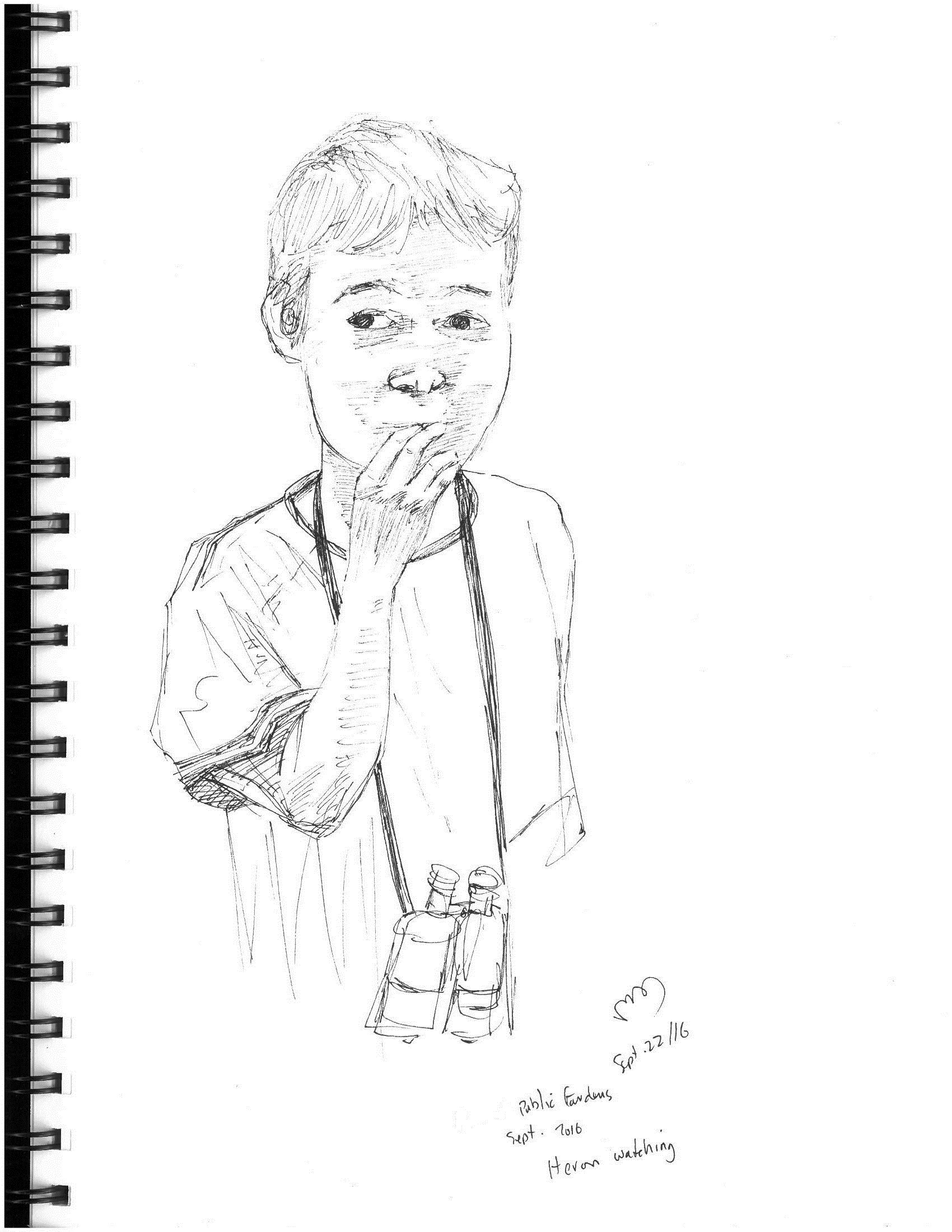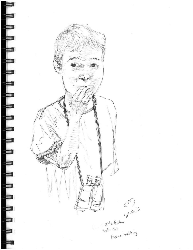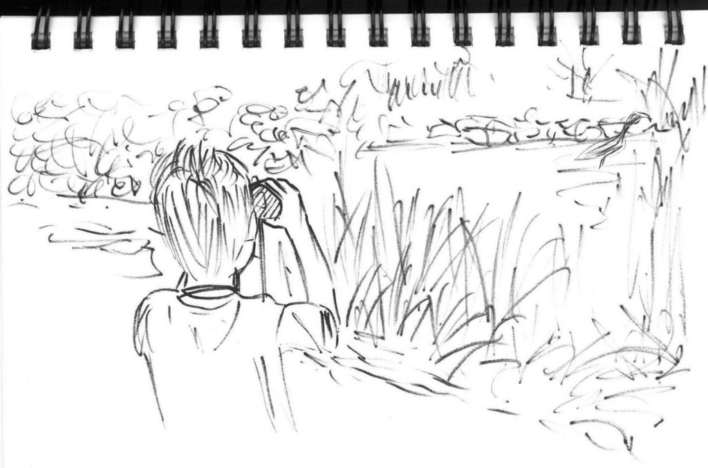 A month’s worth of sketching later and the pen is significantly more depleted but still fun to use. In the next sketch above, I was able to let the pen linger on the page without the ink soaking through to the other side or the page beneath. Now that I look at the sketch, I should have applied darker lines on the Great Blue Heron (top right corner) to help it stand out from plants along the bank of the pond.