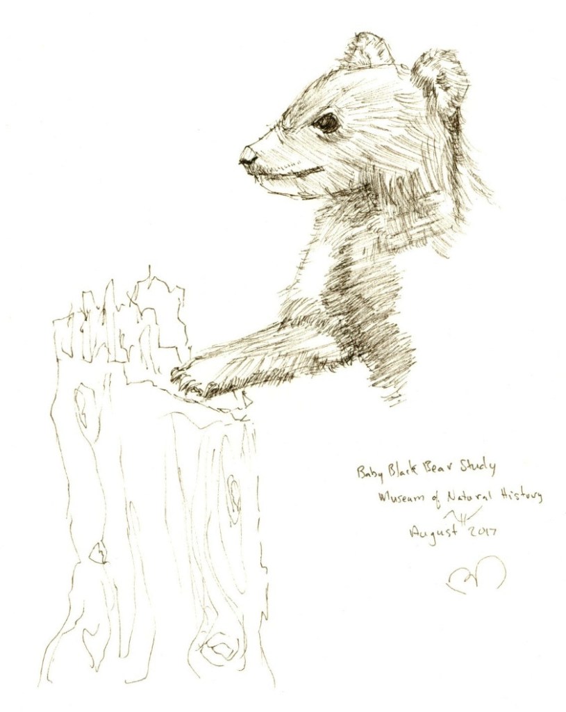 Below is a quick sketch of a baby black bear from the wildlife reconstruction exhibit at the Nova Scotia Museum of Natural History. It was late August, the museum was bustling with summer tourists, and I had to render this particular sketch with a group of museum visitors looking over my shoulder. What I like about this sketch is the contrast of the long hatch marks used for the bears fur with the contour lines that make of the tree stump.