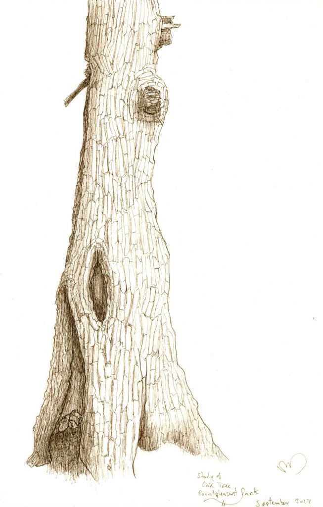 By September I had begun to slow down the sketching process by spending more time on rendering the values so as to develop better the form of the object. No longer a preliminary study or sketch of an oak tree (as originally intended), the image below takes on a more finished quality of a so called drawing. Really, my goal was simply to create a detailed sketch of this beautiful old oak tree near the Pleasant street entrance of Halifax Point Pleasant Park.