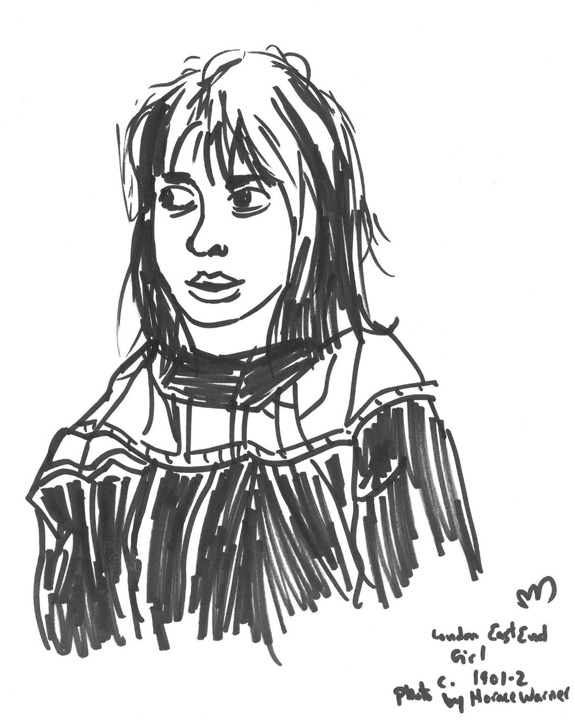 The experience of sketching that photo of those children prompted me to to do some Google searches for other photographs of London slum children. Those searches led me to the work of Horace Warner and his photographic record of what has been since called affectionately the “Spitalfields Nippers” of London’s East End. The photos were taken sometime between 1901-1912 and a broad selection of heartbreaking images with an informative write-up can be found at spitalfieldslife.com.