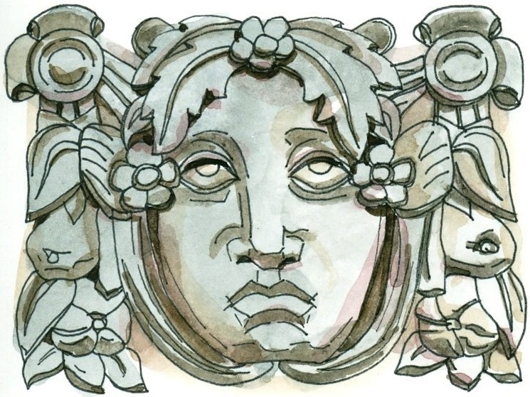 It wasn’t until 2009 that I discovered my first Foliate Head carving after moving my family to the harbour city of Halifax, Nova Scotia. I was excited to see intricately craved Green Man heads on the Halifax Court House, a Victorian Italian Renaissance structure built predominantly in 1863 by the Scottish born stonemason George Lang (1821-1881). You can see my ink and watercolour depiction of one of Lang’s Green Man heads at the very top-left of this blog post.