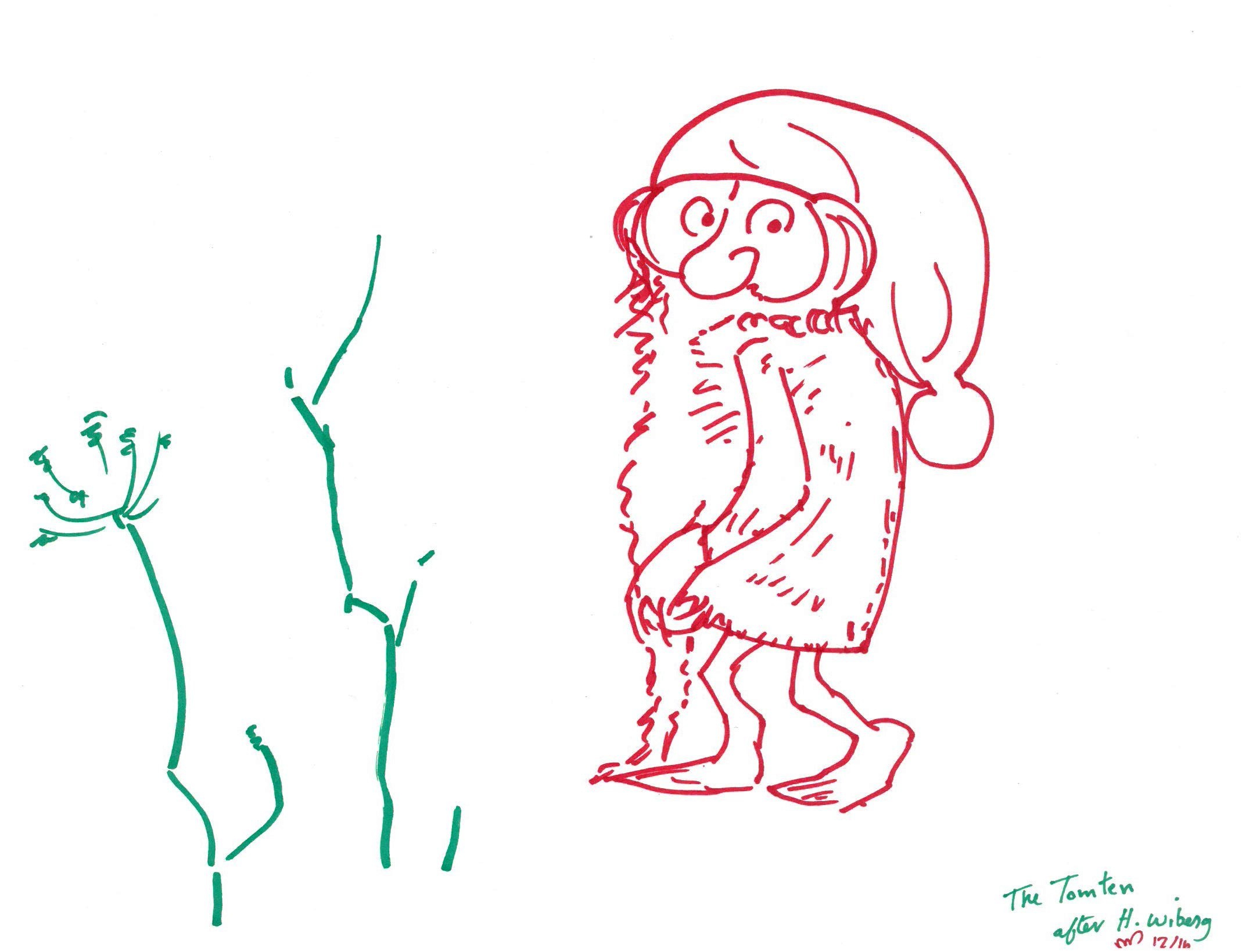 Our fascination grew quickly, and I started to sketch and draw the Tomten using Swedish artist Harald Wiberg’s archetypal Tomten as my inspiration. Below you will find additional Tomtens based on the works of other Swedish artists such as Jenny Nystrom, and Lennart Helje, as well Norwegian artist Kjell Midthun.